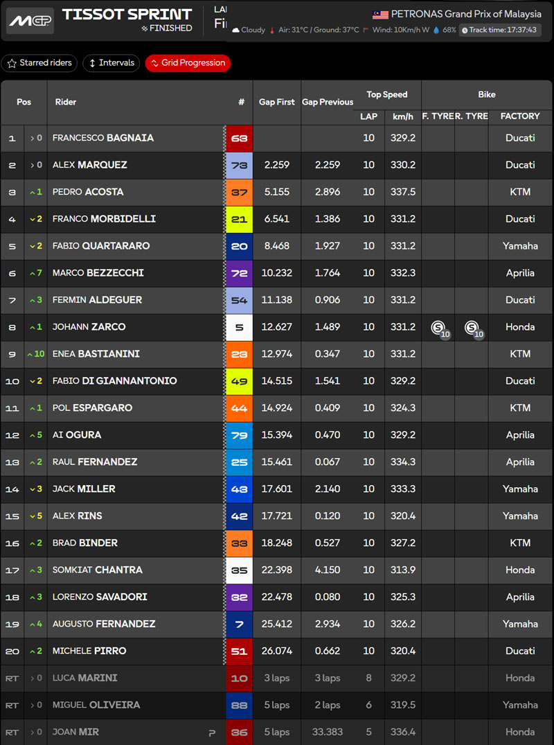 La Sprint sur le tracé de Sepang apportait toutefois une belle satisfaction à Marco Bezzecchi, qui se classait finalement 6e après les chutes des pilotes Honda et la pénalité infligée à Fermin Aldeguer.