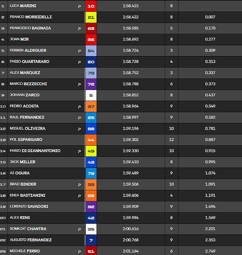 Quoi qu’il en soit, presque 3 dixièmes derrière ces deux hommes, on trouvait Jack Miller (Prima Pramac Yamaha MotoGP), Joan Mir (Honda HRC Castrol), Fabio Quartararo (Monster Energy Yamaha MotoGP), Fabio Di Giannantonio (Pertamina Enduro VR46 Racing Team), Franco Morbidelli (Pertamina Enduro VR46 Racing Team), Pol Espargaro (Red Bull KTM Tech3), Alex Marquez (BK8 Gresini Racing MotoGP) et Alex Rins (Monster Energy Yamaha MotoGP) satisfaits de leur passage direct en Qualification 2.