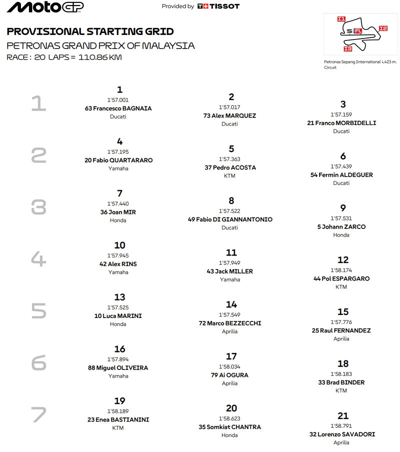 A l’issue des essais et des qualifications du Grand Prix de Malaisie MotoGP, très nombreux sont les pilotes qui peuvent prétendre à monter sur le podium du Sprint aujourd’hui à Sepang…