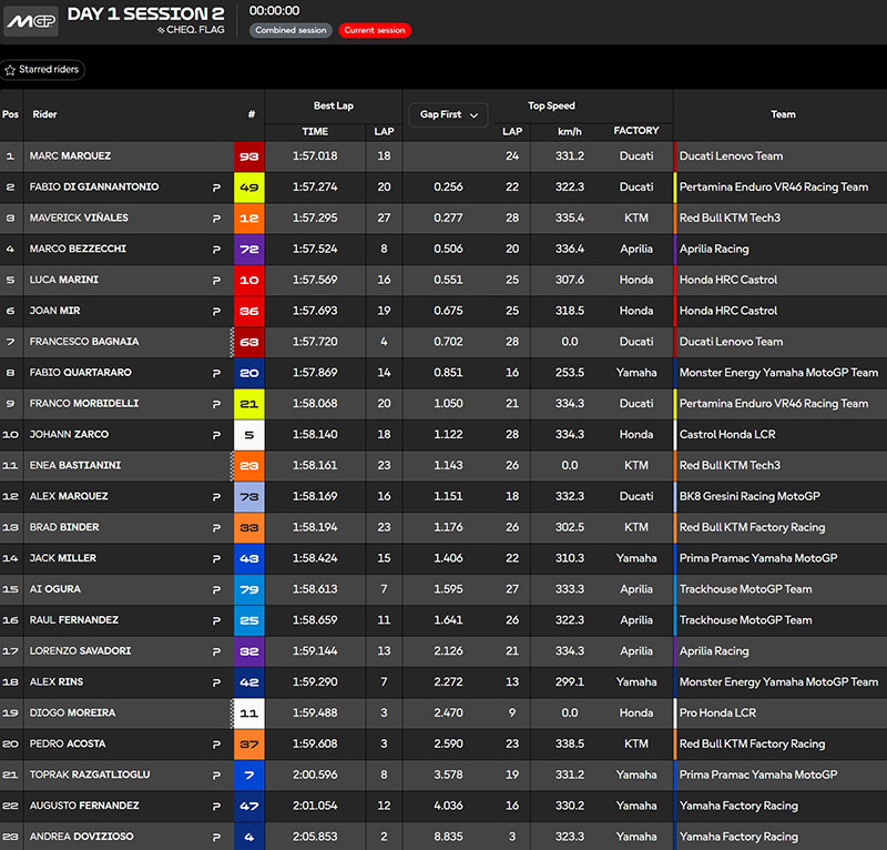 Marco Bezzecchi était d’abord très heureux de retrouver la piste après un long hiver. « C’était génial de piloter à nouveau la MotoGP. Elle est super rapide. Le premier relais est toujours très détendu. La première fois qu’on est à fond, ça fait quelque chose, car on a l’habitude de rouler au ranch sur la RSV-4, mais là, c’est un autre monde ! » lisait-on sur Speedweek.