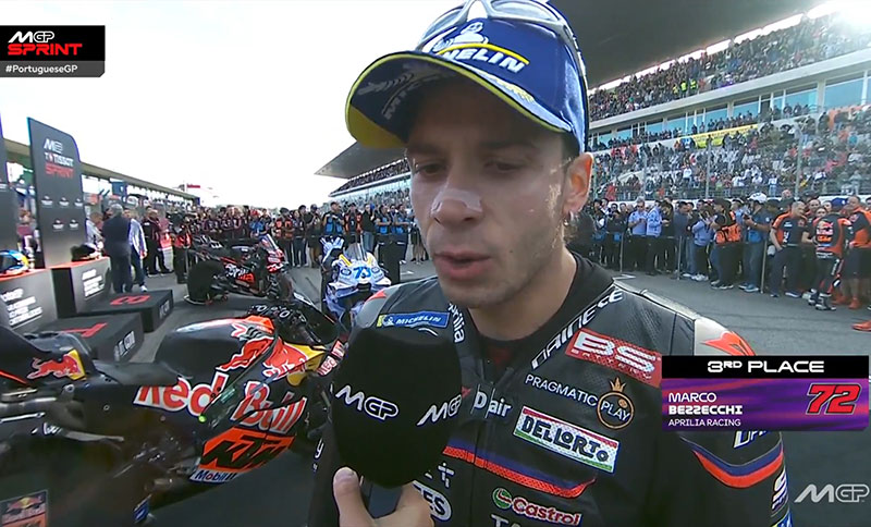 À peine descendu de son Aprilia RS-GP du team d’usine Aprilia Racing après avoir terminé 3e la course sprint du Grand Prix du Portugal 2025 à Portimão, le poleman Marco Bezzecchi s’est confié devant les caméras du site officiel MotoGP.com en ayant décidé de plutôt voir le verre à moitié plein qu’à moitié vide, sans doute en pensant à la 3e place du championnat…
