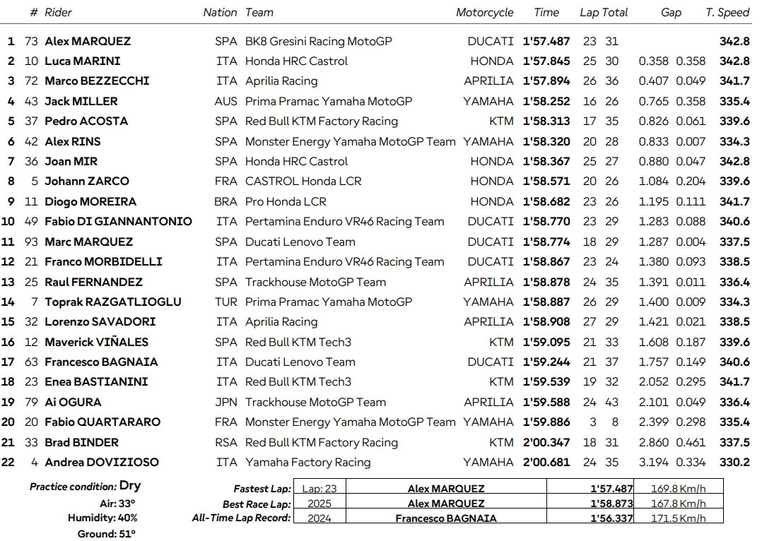La séance s’est conclue avec un meilleur temps de 1’57.487 obtenu par Alex Marquez.