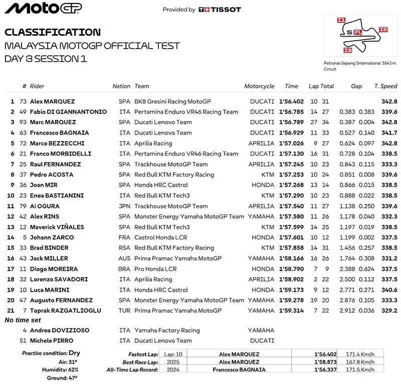 Et que question relative déception, Ducati Lenovo et Gresini Racing n’ont pas progressé, bien au contraire; car si Francesco Bagnaia a de nouveau terminé 8e, Marc Márquez, champion du monde en titre et leader la veille, a levé le pied lors de cette deuxième journée, terminant 15e après 30 tours. Alex Márquez (BK8 Gresini Racing MotoGP) a quant à lui chuté au virage 5 en testant l’aéro 2024. Indemne, il est reparti brièvement en piste lors de la courte fenêtre sèche de l’après-midi, sans améliorer son temps matinal, concluant la journée 12e.