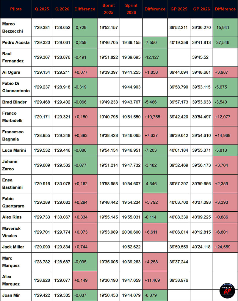 Mais il est vraiment dommage que Marco Bezzecchi n’ait pas résisté à la pression mise par Marc Márquez derrière lui lors du Sprint car, notre tableau ne ment pas, il s’agit bien du pilote ayant le plus progressé sur un tour chrono entre 2025 et 2026.