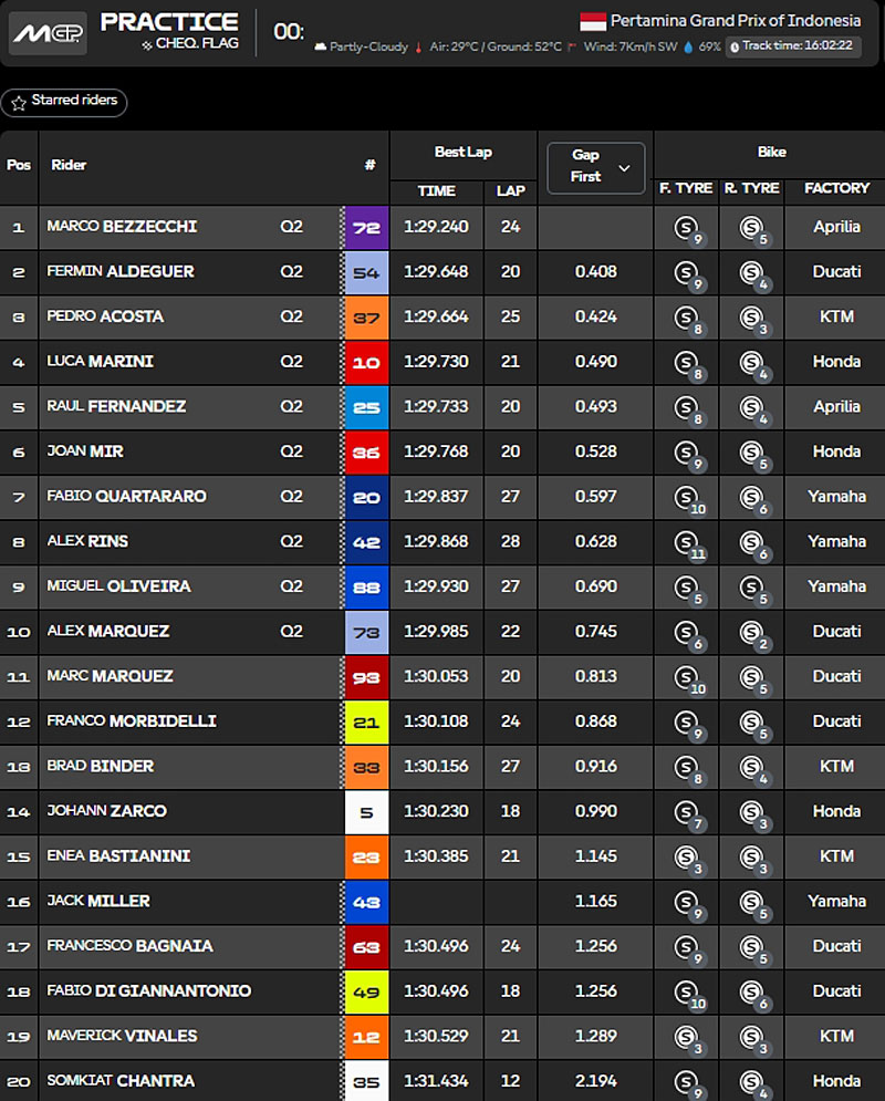 Résultat de la Practice au Grand Prix d’Indonésie MotoGP 2025 :