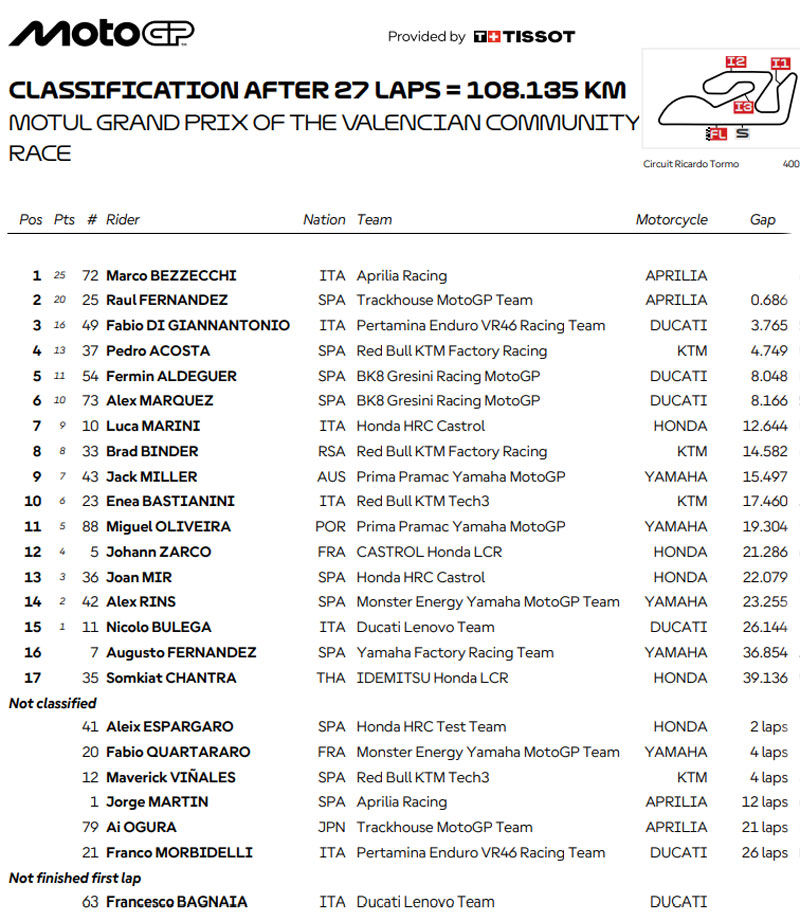 La conférence de presse au terme du Grand Prix MotoGP de la communauté valencienne 2025 a réuni à Valence Marco Bezzecchi (Aprilia Racing), Raul Fernandez (Trackhouse MotoGP Team) et Fabio Di Giannantonio ( Pertamina Enduro VR46 Racing Team) pour leur débriefing d’après course.