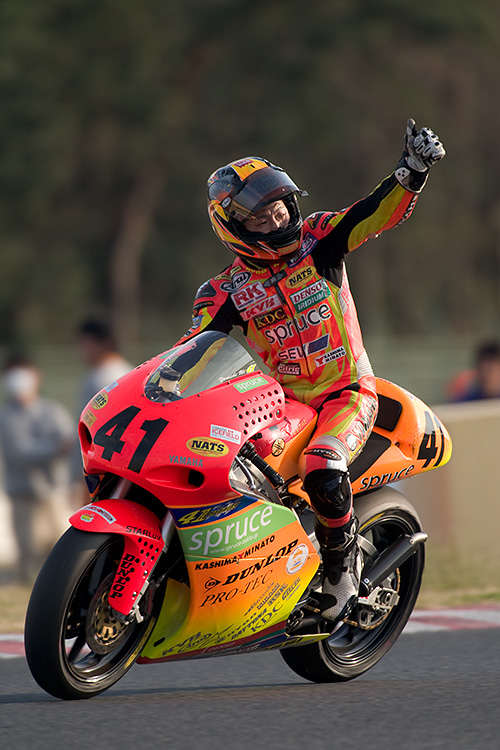 Au soir du Grand Prix de la Communauté valencienne – qui n’est pas le dernier de la saison comme maintenant – Ui est dos au mur. Il n’avait gagné que deux fois, et s’il ne réagissait pas maintenant, tout était perdu. Dès lors, il part en mission, comme Miguel Oliveira en Moto3 à la fin de l’année 2015. Victoire à Motegi, puis en Australie, mais aussi en Malaisie et, finalement, au Brésil. Avec quatre succès sur les quatre dernières sorties, il a tout donné. Mais Poggiali n’a pas craqué, lui qui contenait le retour du Japonais depuis la deuxième place sur trois GP. Poggiali est titré, et Ui, avec six victoires sur la campagne, ne peut que le féliciter. D’ailleurs, à l’époque, il égale le record de Kenny Roberts en 1983, qui, lui aussi, triompha à six reprises en 500cc sans gagner le titre, échouant pour deux points contre Freddie Spencer.