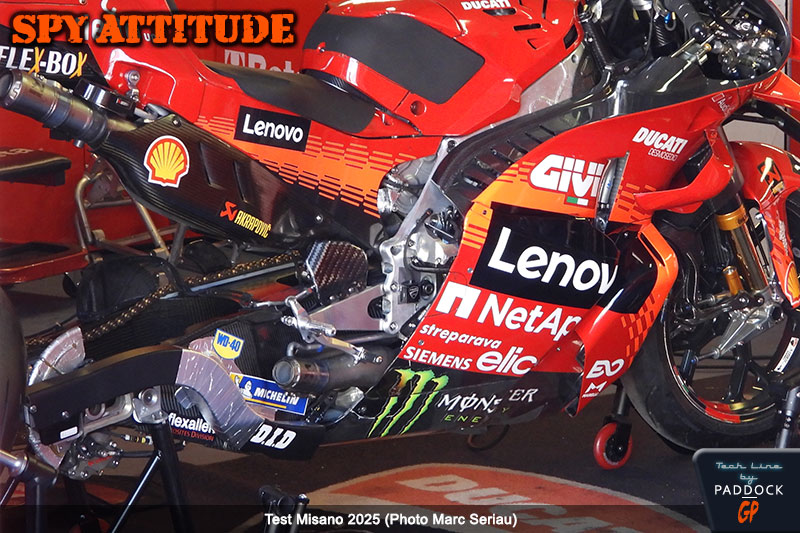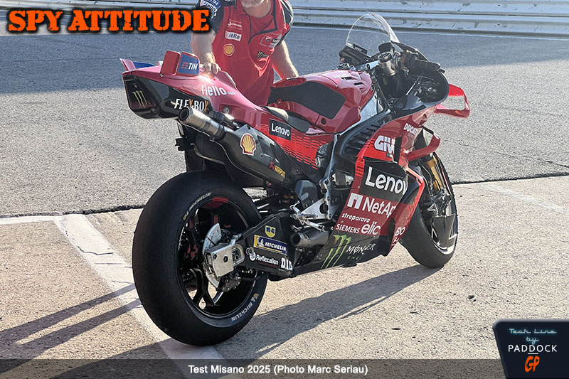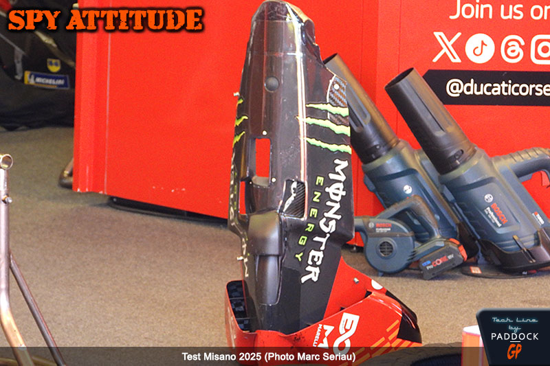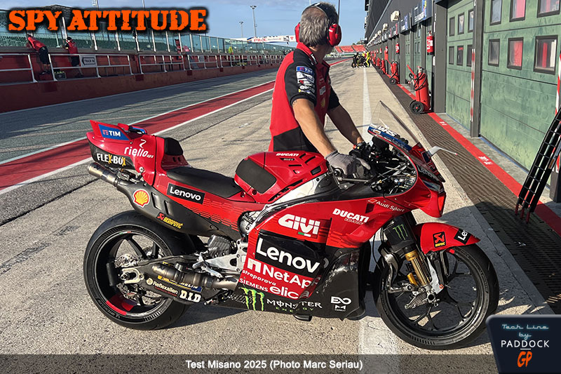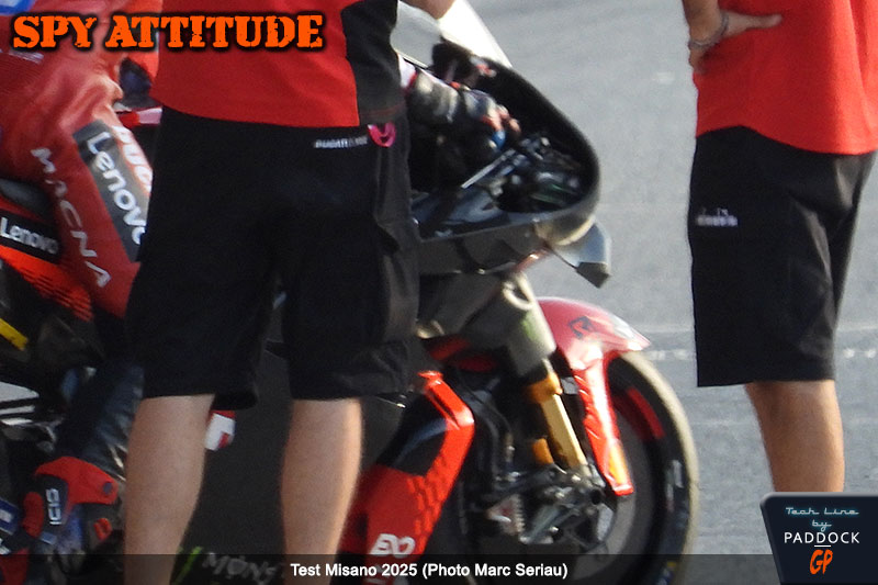 Déception car dans le box officiel, il n’y avait rien de visuellement nouveau. Lors de la chauffe matinale, on pouvait tout au plus observer que Francesco Bagnaia semblait encore hésiter entre les deux versions aérodynamiques homologuées cette année (il court avec la première version style 2024, Marc Marquez la deuxième, avec les énormes Downwash Ducts, les ailerons avants en escalier et les ailes inversées sur la selle), mais c’était à peu près tout.