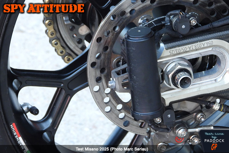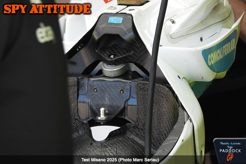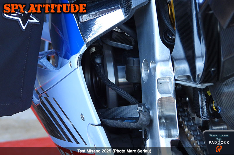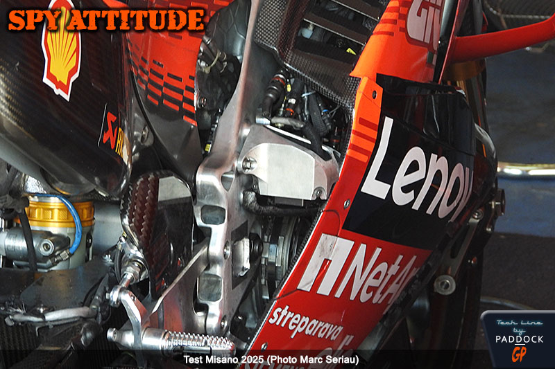 En passant devant le box de la VR46, nous avons aperçu ce qui semble être le bâti du Mass Damper, un élément que Ducati n’a encore jamais officiellement montré, et que nous avons à peine aperçu chez Aprilia l’an passé.