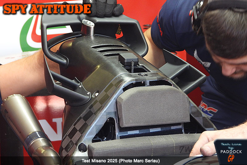 Il intègre le bossage destiné à procurer de l’effet de sol, une solution propre à Honda, en lieu et place des dérives de bras oscillant chez Aprilia, KTM et Yamaha.
