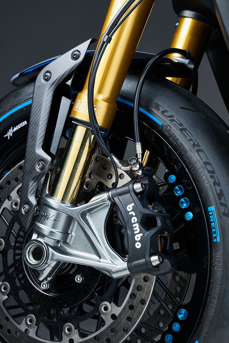 L’échappement est soutenu par un nouveau support d’échappement en titane, exemple parfait de l’attention portée au détail par MV Agusta, transformant un élément structurel fonctionnel en véritable signature esthétique.