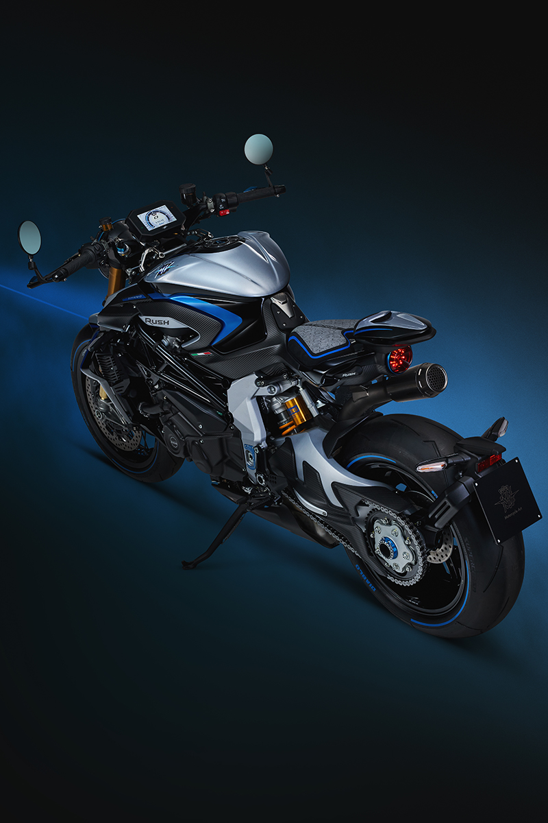 Au cœur de la Rush Titanio se trouve un moteur quatre-cylindres en ligne de 1 000 cm³, profondément évolué, conçu pour offrir des performances exceptionnelles sur toute la plage de régime. Fabriqué à la main à Varèse, il incarne une excellence technique sans compromis, avec un recours massif au titane, notamment 16 soupapes radiales en titane et quatre bielles forgées en titane.