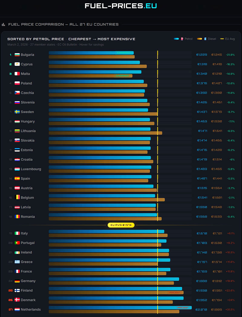 Dans les pays limitrophes, seule l’Italie applique une TICPE plus élevée, ainsi qu’une TVA à 22%, mais possède un coût de revient moins élevé.