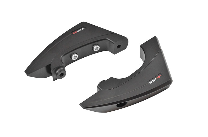 Autres équipements déjà disponibles pour la Kawasaki Z1100, une paire de patins crash-pads. Des éléments presque indispensables dès lors que l’on roule sur route pour venir sécuriser le moteur et le cadre. Les patins amenés à être en contact avec le sol durant la chute sont usinés à partir d’un bloc d’ertacétal, un matériau composite de type polyacetal copolymère plébiscité pour sa haute résistance mécanique, sa rigidité et sa dureté. Il présente également l’avantage d’apporter une grande résistance aux chocs et à l’usure tout en favorisant la glisse. Leur design est épuré avec un profilé aérodynamique. La protection se monte au moyen d’une platine avec deux points de fixation pour une protection efficace. De couleur noire, l’ensemble platine + patin s’intègre parfaitement sans dénaturer la ligne du nouveau roadster Z1100.