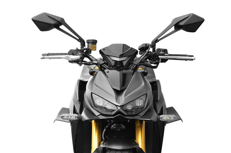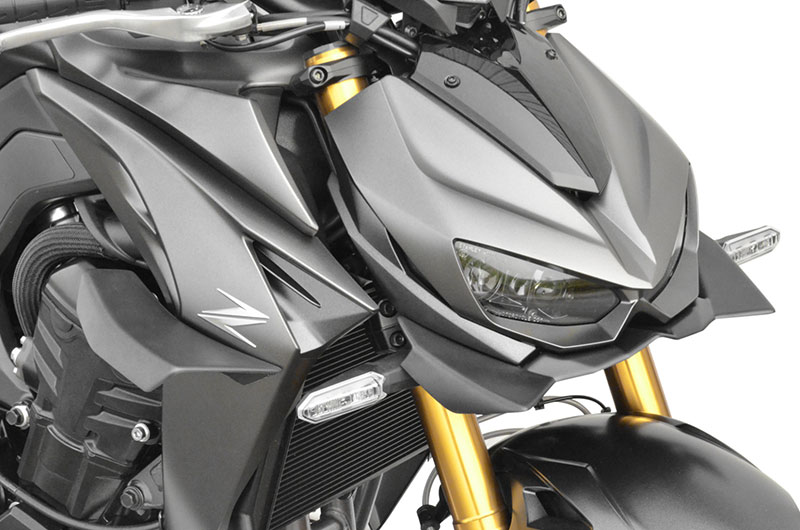 Le gros roadster Kawasaki se voit à son tour doté d’un kit aéro largement inspiré de l’univers de la compétition moto et du travail en soufflerie de ces dernières années. Dans les bureaux de la marque, les équipes de R&D ont imaginé plusieurs pièces aérodynamiques spécialement pour la Kawasaki 1100 pour former un kit composé de trois ailerons fabriqués en plastique ABS. Il comprend un béquet sous l’optique de phare ainsi que deux ailerons pour accessoiriser les écopes de radiateur, renforçant ainsi le look de la nouvelle Z1100 en lui apportant une ligne très aérodynamique. Chacune des pièces est livrée dans une finition noir mat et proposée séparément à la vente.