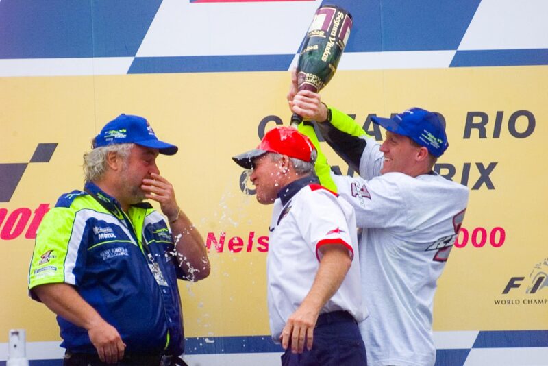 En 2000, il changea à nouveau de dimension. Pour rappel, il y a deux ans à peine, il pointait à la 16e place du général. Respect. Le duel concerne sa personne et un rookie du nom de Valentino Rossi, version teinture blonde et numéro noir. Mais rapidement, le destin choisit son camp. En franchissant la ligne d’arrivée du GP du Brésil en sixième place, Roberts Jr devint le premier champion fils d’un champion et rentra ainsi dans l’histoire. Sur la saison, Kenny a triomphé de quatre manches, signé quatre pole positions, et réalisé cinq autres podiums. Un exercice des plus solides pour un pilote mémorable. Un moment émouvant, vécu en famille à l’arrivée de ladite manche sud-américaine. Il met ici fin à une série de six titres consécutifs pour Honda, qui raflait tout depuis 1994.