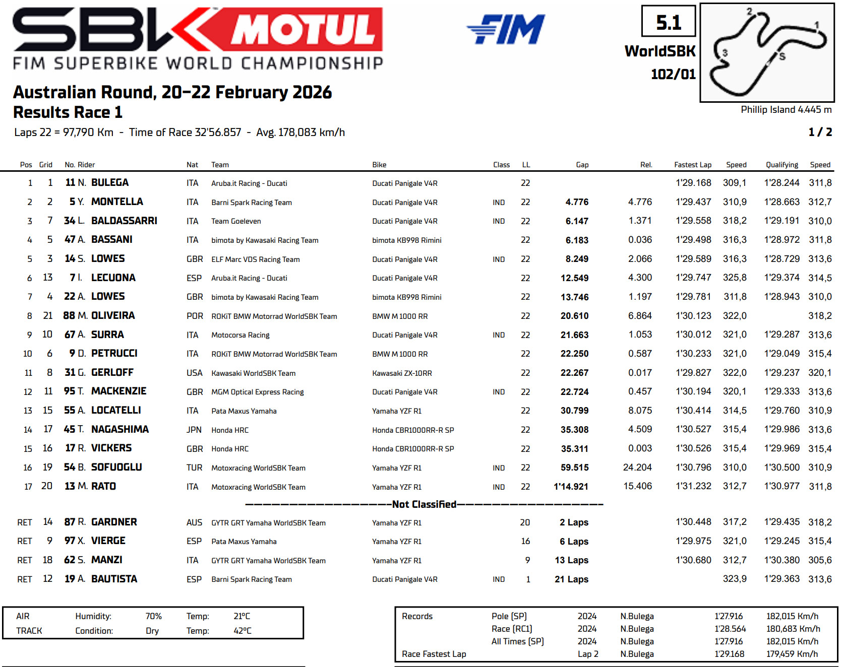 La course d’ouverture de la saison Superbike WorldSBK 2026 a vu Nicolo Bulega (Aruba.it Racing – Ducati) dominer les 22 tours disputés sur le circuit de Phillip Island Grand Prix Circuit, alors que Ducati a monopolisé ce premier podium en Australie.