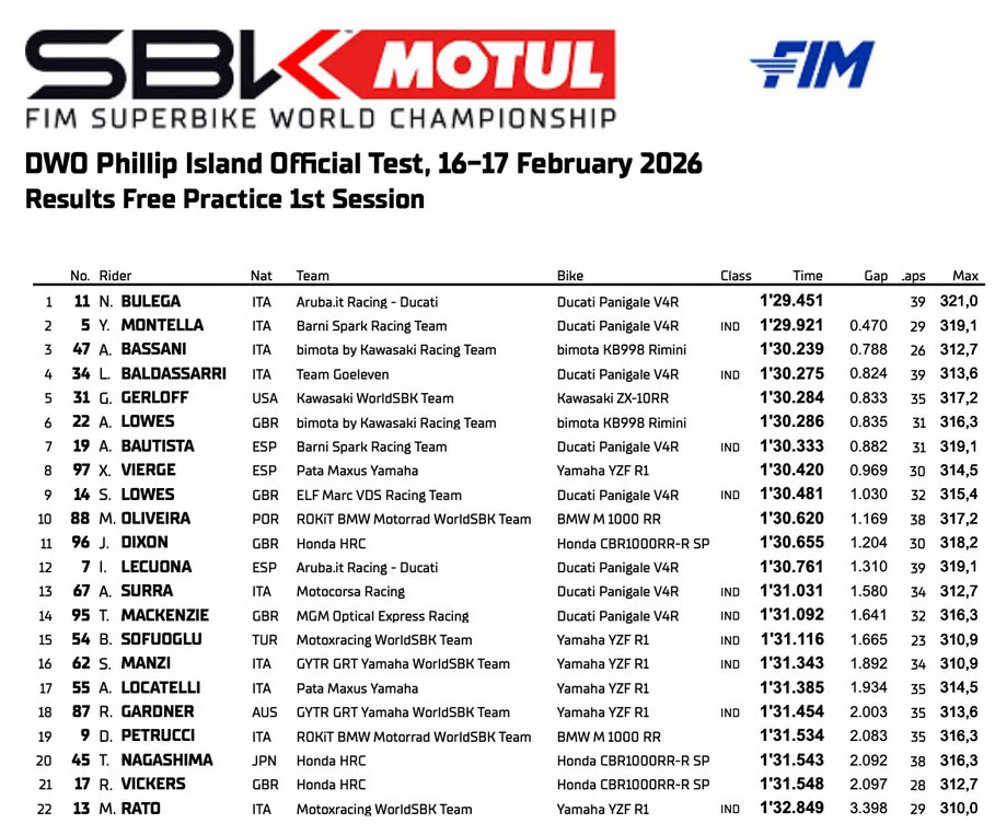 La séance s’est déroulée dans des conditions idéales, avec 27 °C dans l’air et 32 °C sur la piste, offrant ainsi un premier classement relativement représentatif de la saison 2026. Le fait marquant, toujours du côté Ducati, est la compétitivité des Panigale privées : Yari Montella (team Barni) signe le deuxième temps. Début également remarquable pour Lorenzo Baldassarri avec Go Eleven : l’après-Andrea Iannone commence sous de bons auspices. Parmi le quatuor italien aux avant-postes figure aussi Axel Bassani, troisième avec la Bimota. Devancer Alex Lowes (sixième) constitue un signal très encourageant, même s’il ne faut pas oublier que nous ne sommes que lundi…