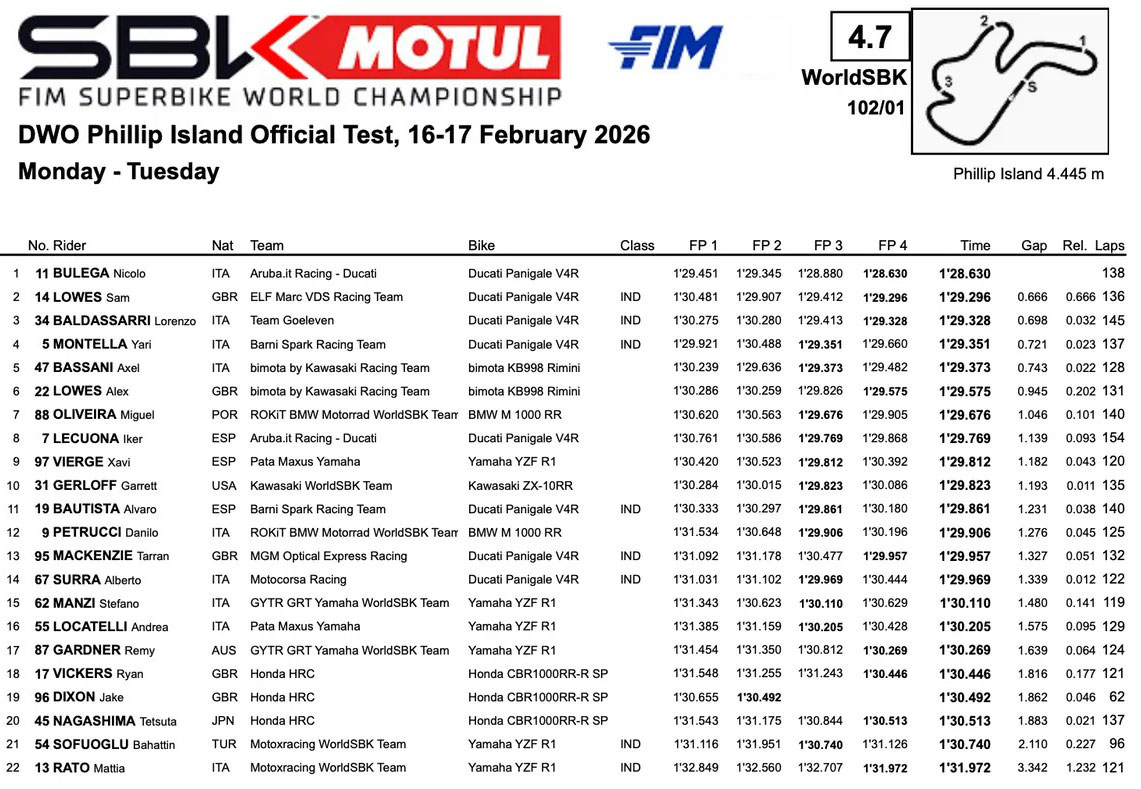 Après un hiver marqué par des conditions météorologiques défavorables, qui ont pratiquement compromis les essais européens, le paddock du WorldSBK Superbike s’est déplacé en Australie, où un soleil éclatant a illuminé la première journée du test de deux jours sur le circuit de Phillip Island, d’emblée dominé par Nicolò Bulega.