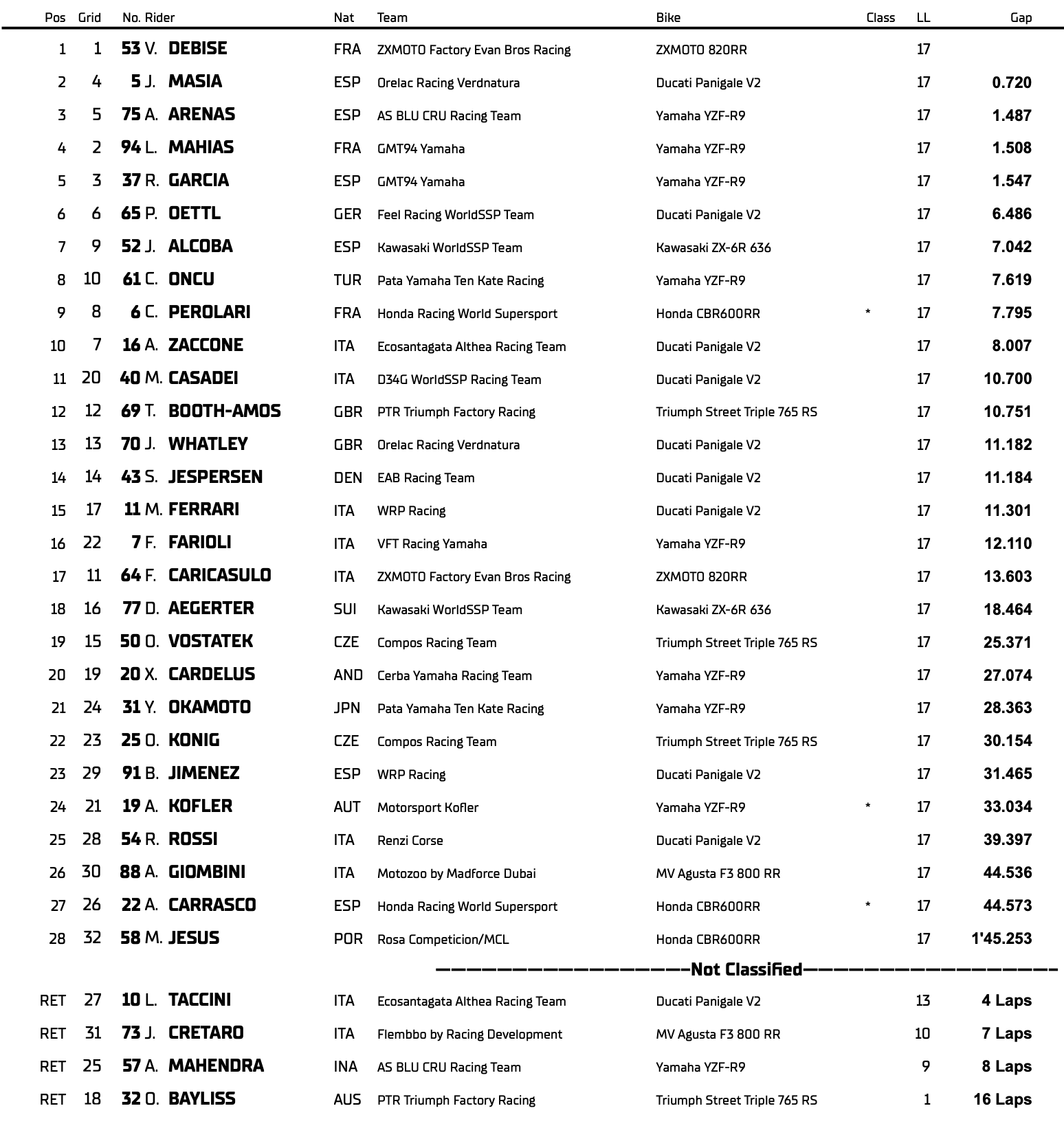 Lucas Mahias, longtemps leader, échoue à seulement vingt millièmes du podium. L’ancien champion du monde Supersport repart frustré, après avoir mené les premiers tours et tenu tête au peloton jusqu’à son erreur en fin de course. Derrière lui, son coéquipier Roberto García poursuit son apprentissage avec une solide cinquième place, après un mano a mano énergique avec Arenas.