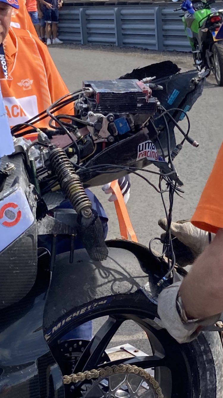 Sur la première photo, qui est due à Vaclav Duska Jr et a été publiée sur le site mcnews.com.au (retrouvez-la ici en grande taille), on aperçoit l’arrière de la selle éventrée d’une Ducati du team Gresini Racing à Sepang. On peut donc en déduire qu’il s’agit de la Ducati GP 21 dont Fabio Di Giannantonio a perdu le contrôle lors de la FP3.