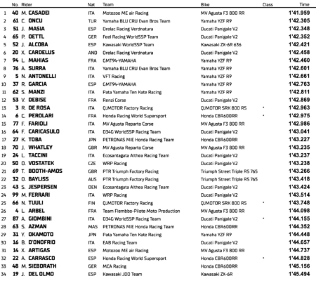 Le pilote andorran Xavi Cardelus a établi son meilleur résultat en Superpole cette saison avec une sixième place, surprenant Lucas Mahias (GMT94-Yamaha), pénalisé pour non-respect d’un drapeau jaune et rétrogradé. Parmi les faits notables, Alberto Surra a pu collaborer avec Oncu pour conserver la deuxième place sur la grille, alors que Niccolò Antonelli et Roberto Garcia ont démontré de belles velléités à domicile.