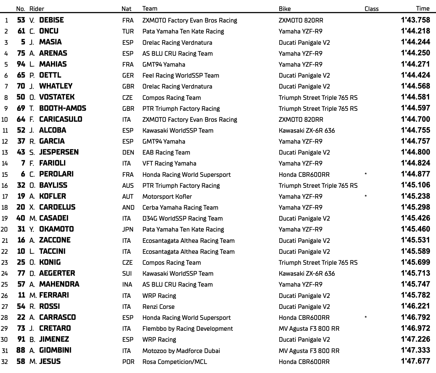 Il faut aller chercher un peu plus loin pour trouver le 3e Tricolore du plateau. Corentin Perolari et Honda Racing World Supersport terminent 15e pour leur entame de championnat au Portugal. Troisième du classement général, Matteo Ferrari n’est que 26e de la séance d’Essais Libres, et devra donc rebondir durant la suite des hostilités pour honorer son statut.