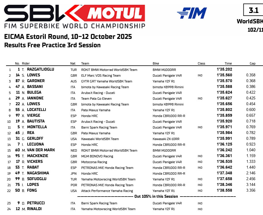 Le poursuivant au championnat du monde (36 points à rattraper sur Toprak) a terminé cinquième, au milieu d’un groupe de six pilotes regroupés en un seul dixième. Le phénomène BMW s’est défié lui-même, avec une série de passages impressionnants. Derrière, la mêlée fait rage : belle séance également pour Axel Bassani et Andrea Iannone, qui ont pris en sandwich Bulega, à la recherche de la clé technique pour relever le défi.